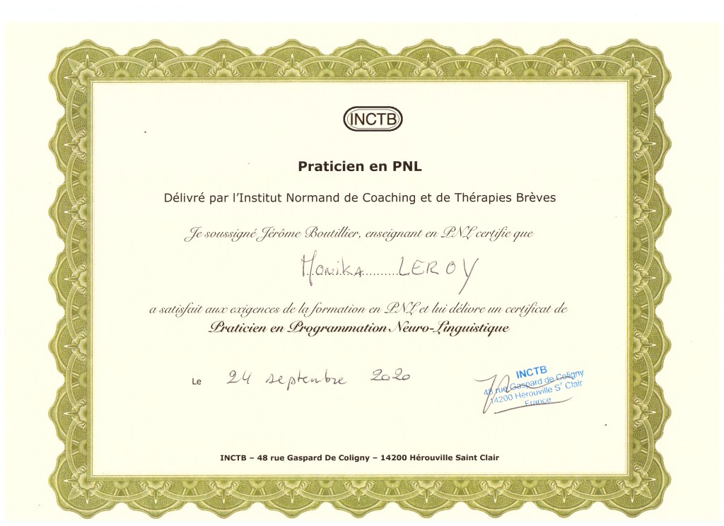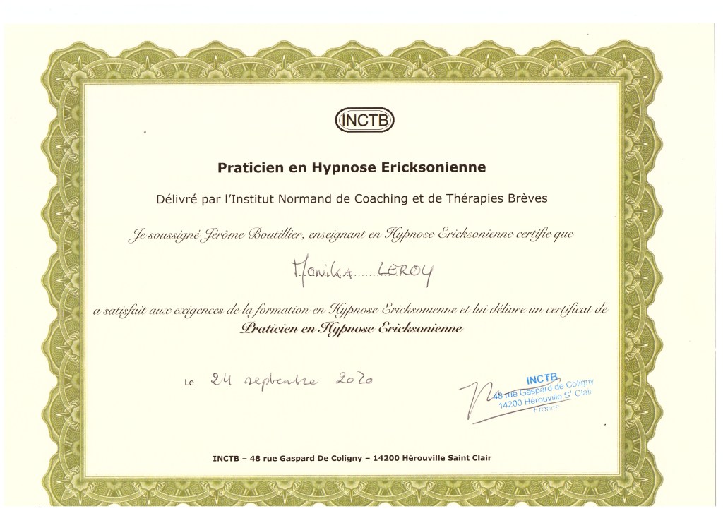 Cursus de formation suivit auprès de l’Institut Normand de Coaching et Thérapies Brèves, I.N.C.T.B, auprès de Jérôme Boutillier